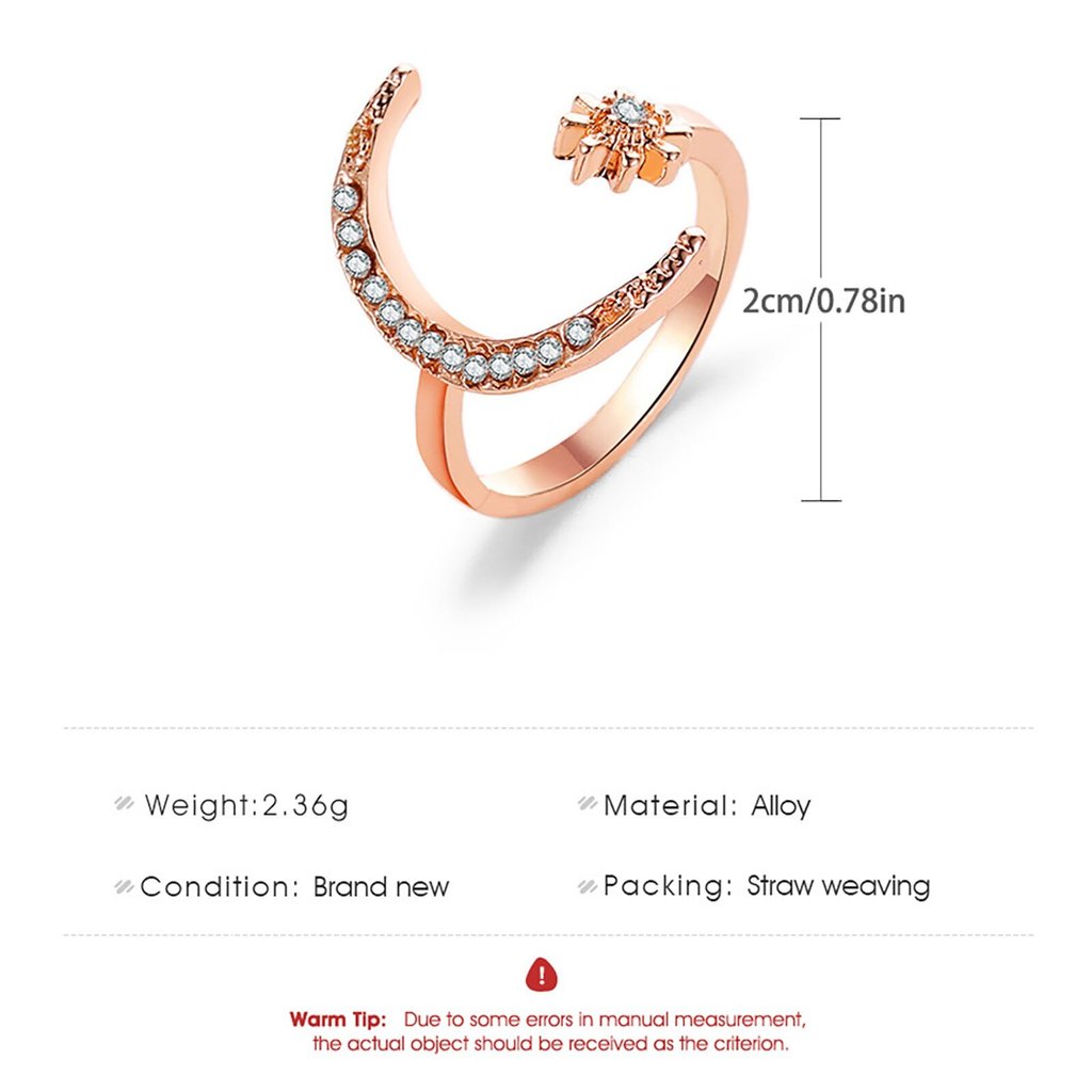 By the luminous presence of moon, this open ringfeatures textured crescent moon and an eight-pointed starembellished with sparkly gemstones. The high quality Cubic Zirconia with diamond-cutting enhances reflection, shining your elegance with an understated charm.